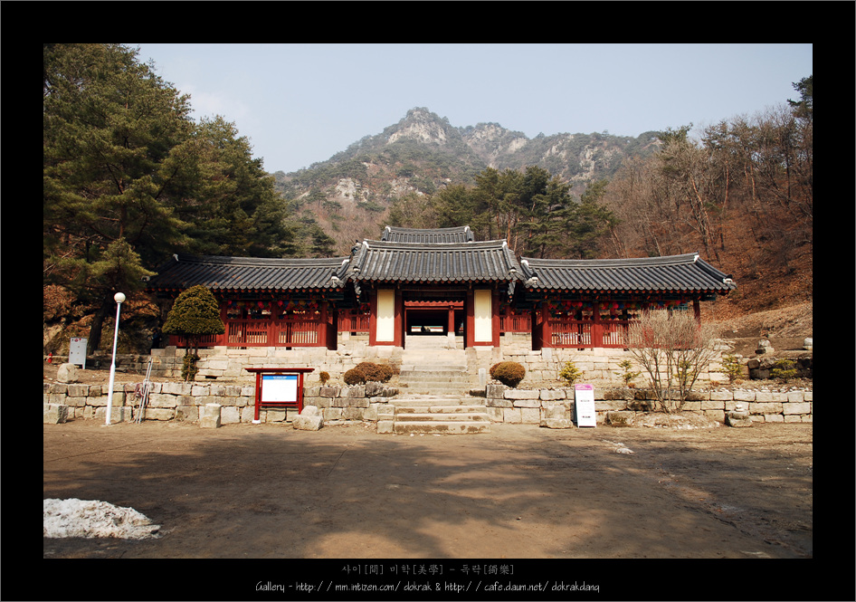부안 내소사와 같이 뒷산의 산세를 절묘하게 끌어들여 사찰의 형태를 구성하였습니다. 날카로운 산세를 너를 행랑으로 받아주어 수직과 수평이 혼재하여 눈에 거슬리지 않는 조화로운 풍경을 자아 냅니다.